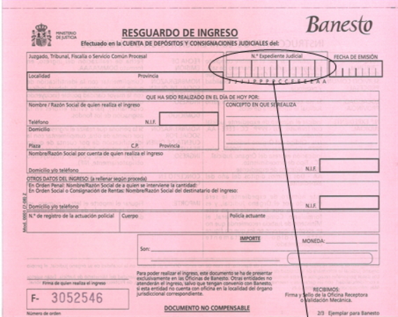 A) Para el caso de que se realice la consignación directamente en la oficina de Banesto, allí le facilitarán un impreso que deberá rellenar indicando todos los datos del Juzgado, Procedimiento Judicial, así como de y en nombre quién realiza el ingreso y en nombre de quién lo hace y, por supuesto, el importe que se consigna (indicándolo en letra y en cifras)